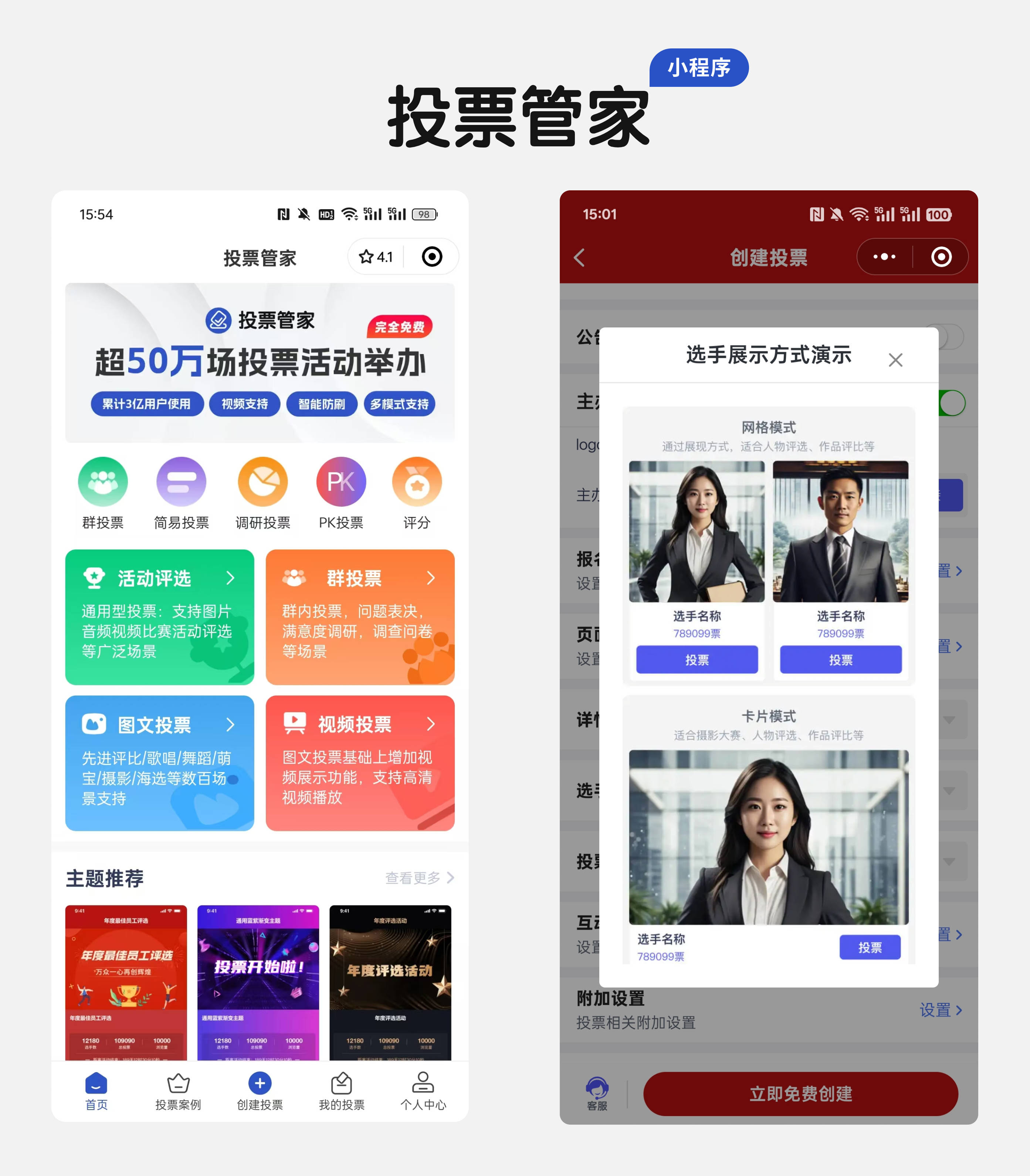 在组织投票活动时,选手的展示方式至关重要,它直接影响着投票者对选手的了解程度和参与积极性。投票管家小程序提供了多种实用且各具特色的选手展示方式,以满足不同类型投票活动的需求。