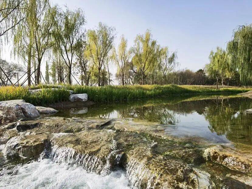 本次河道治理通过引水入园,在公园内部打造了900多米长、近7000平方米的溪流跌水景观。同时利用清河岸线的生态化改造,形成浅滩、湿地等不同生境。并围绕生态岸线.7万平方米。一系列的生态手段改善了区域小气候与水环境。成群结队的野鸭来此筑巢栖息,形成了蓝绿融合、林水相依的滨水绿廊。同时,河道治理连通了两岸2.2公里长的滨水绿道,营造出安全便捷的骑行、步行慢行通廊。